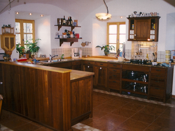 Küche aus Zirbenholz mit Granitarbeitsplatte.